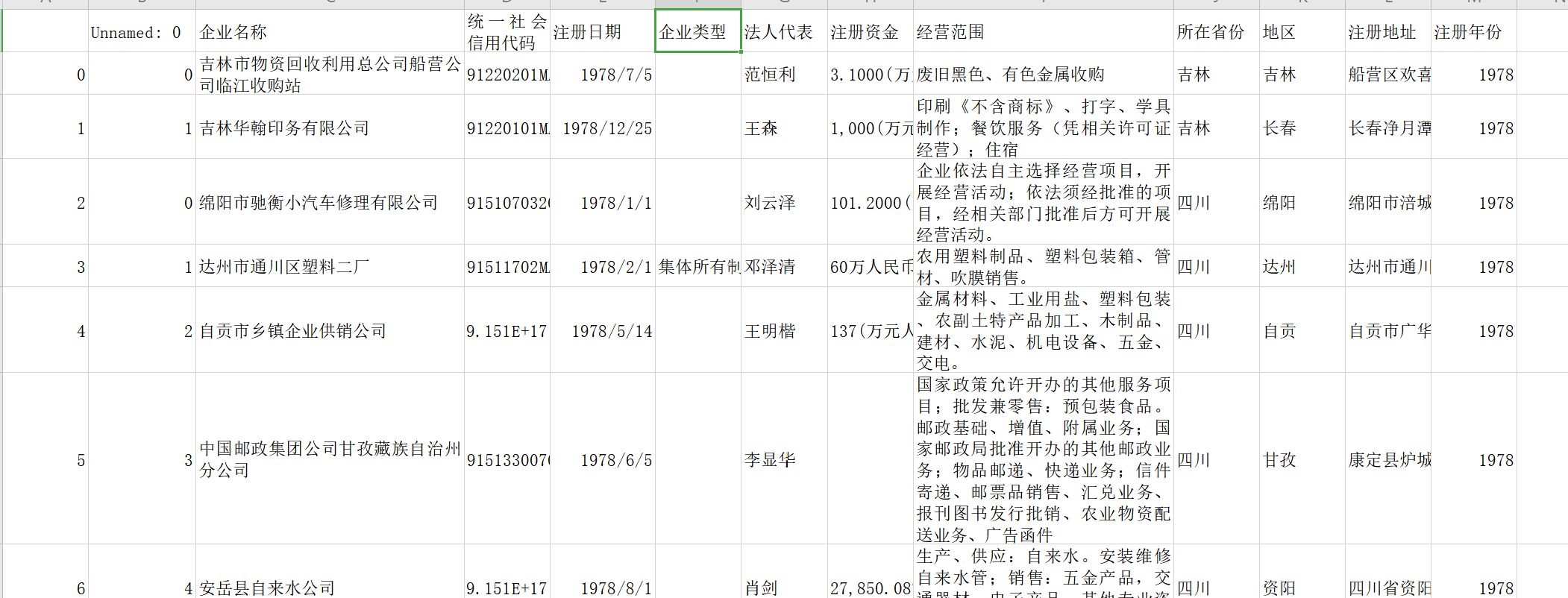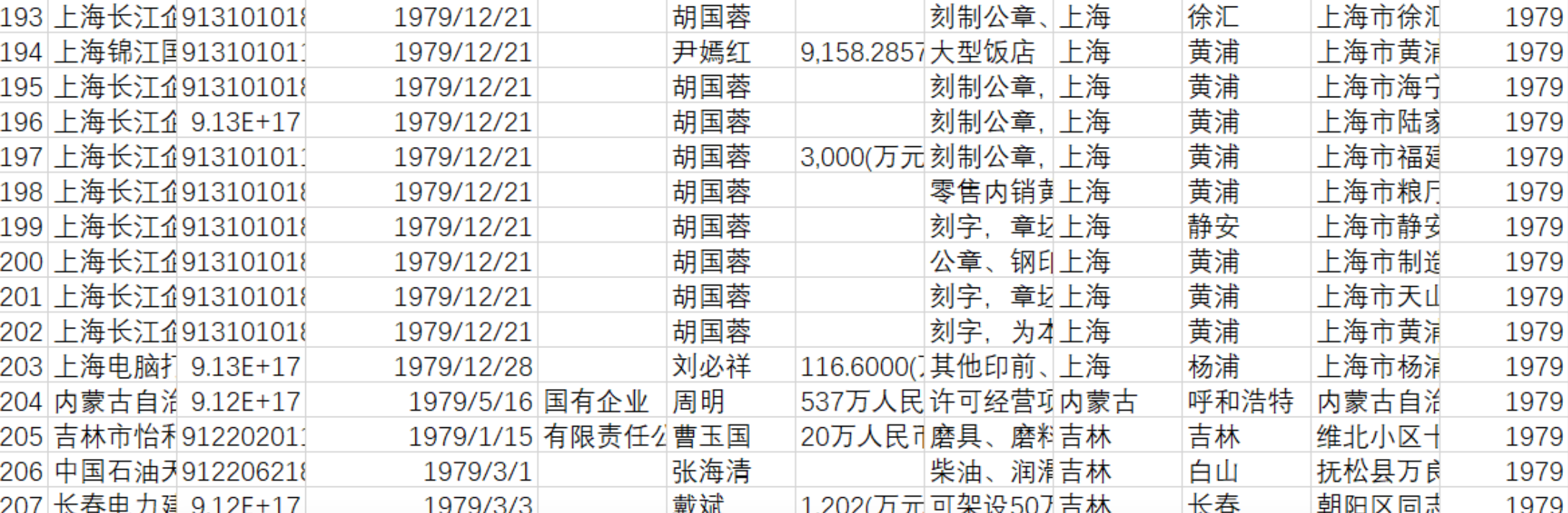 中国各省地市州区县全国企业工商注册变更登记数据信息:企业类型统一社会信用代码法人代表经营范围