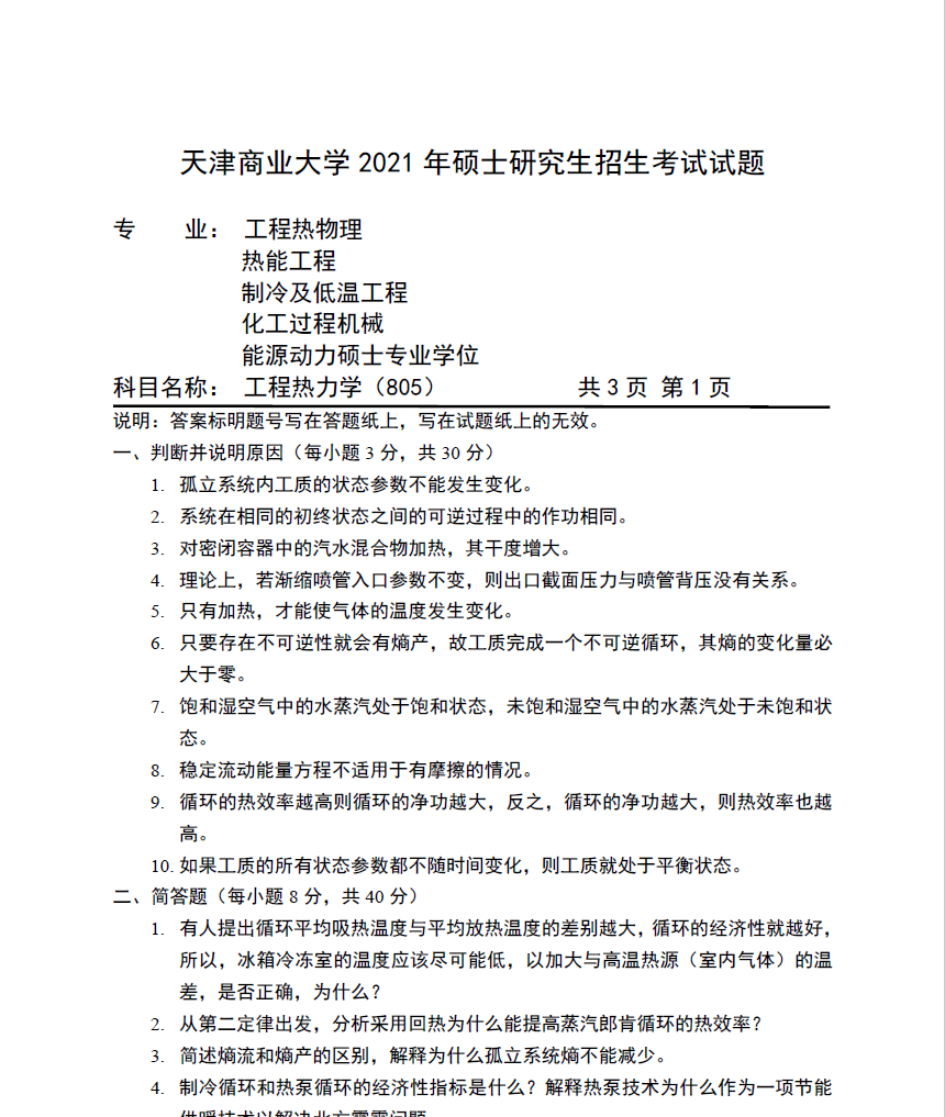 805 工程热力学(天津商业大学2021年硕士研究生招生考试试题).rar