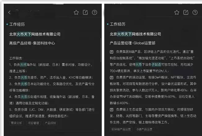 上述用户的共同点在于,大量huobi global工作人员在北京火币天下网络科技有限公司入职,期间涉及多个部门,工作内容也都涉及到实际业务运营,还包括不同部门之间的对接协调。