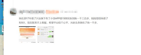 2021年7月6日,有用户投诉2017年在兴业旗下布丁小贷APP借款1500,但实际到款只有1300多元,收取砍头息1000多元。
