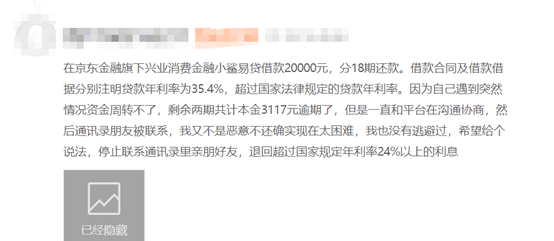 7月8日,有用户称在小鲨易贷借款20000元,分18期还款,年化利率超过24%,最后有两期逾期,虽一直在和平台协商沟通,但通讯录的朋友却被联系。