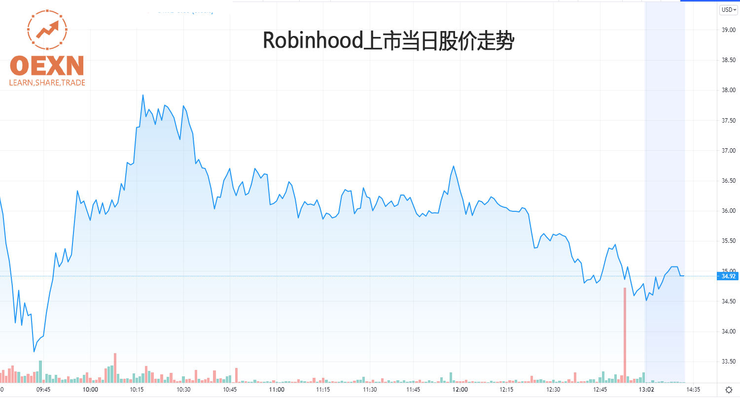 OEXN报道:隔夜美国零售券商之王Robinhood首日破发,开盘报38美元,跌幅一度达13%报33.35美元,截止收盘,股价收跌逾8%至34.82美元。