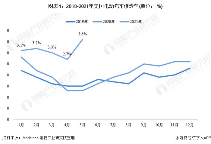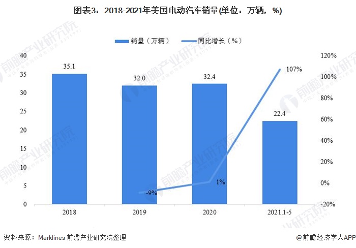 进入2021年,美国电动汽车销量强势增长,电动汽车渗透率也创历史新高。2021年1-5月,美国电动汽车销量达22.4万辆,同比增长107%。2021年5月,美国电动汽车渗透率创下了3.6%的历史新高。