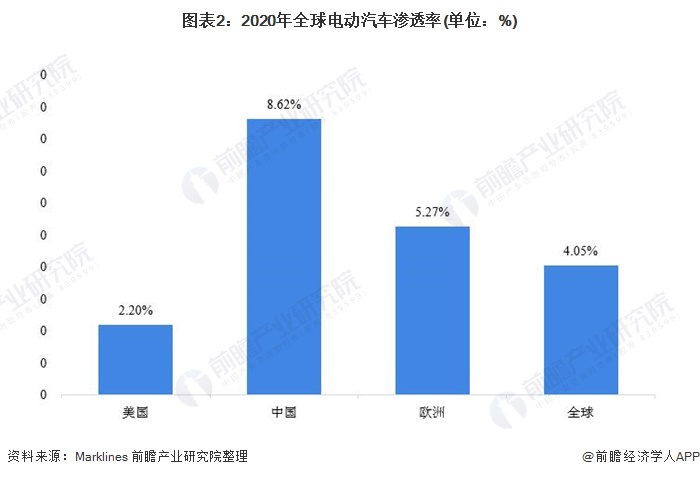 近年来,各国纷纷出台政策和确立目标促进了新能源汽车行业的发展。美国是世界第三大新能源汽车消费国,2020年美国电动汽车销量占全球新能源汽车市场的11%。由于近两年美国对电动汽车的补贴和扶持力度较小,其汽车电动化速度已落后于欧洲和中国。2020年,美国电动汽车渗透率仅为2.2%,远低于欧洲和中国。