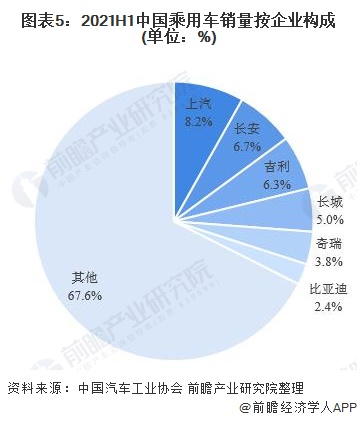 自主品牌乘用车销售方面,2021年上半年,上汽集团以81.6万辆的销量排名第一,占全国乘用车总销量的8.2%;长安和吉利紧随其后,自主品牌乘用车销量分别为67.5万辆和63万辆,占比分别为6.7%和6.3%。