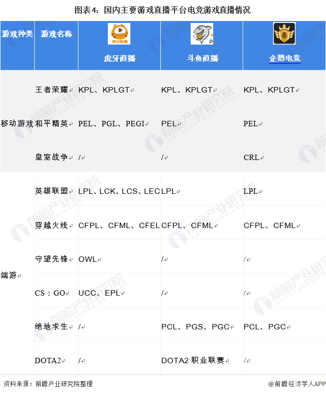 面对火热的电竞行业,众多游戏直播平台也通过直播电竞赛事为平台引流,其中较具有代表性的直播平台有虎牙直播、斗鱼直播、企鹅电竞、快手直播与BLIBLI,具体情况如下: