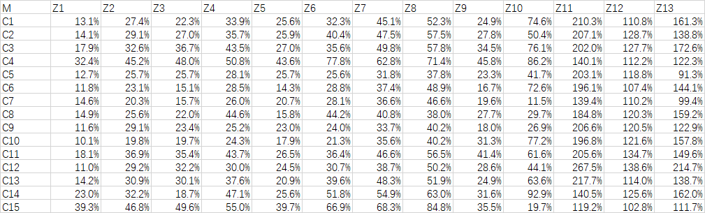 如图及附件,C1-C15为样本,Z1-Z13为变量,现所有数据均为百分比数据,且单个变量数据为越大越好。请教,如何通过各组数据对比分析,获得C1-C15优劣排序的结果?