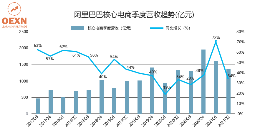 据OEXN的市场策略师表示:“阿里巴巴主要划分为商业、云计算、数字媒体及娱乐创新,其中商业分部贡献收入占集团收入的87.65达1802.41亿,阿里巴巴分部主要包括中国零售、批发、跨境以及全球零售业、菜鸟以及其他部分。”