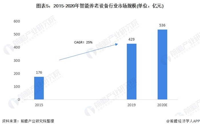 在需求和政策的推动下,我国智能养老设备行业的市场规模快速增长。根据Age club的数据,近四年来我国智能养老设备市场规模快速增长,2015-2019年的复合增长率达到了25%,2019年我国智能养老设备行业的规模达到429亿元,按照智慧养老行业的发展速度,前瞻测算2020年我国智能养老设备行业的规模约在536亿元左右。