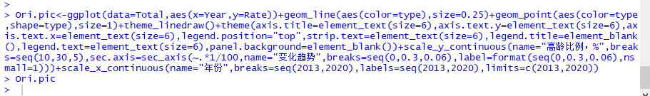 Ori.pic<-ggplot(data=Total,aes(x=Year,y=Rate))+geom_line(aes(color=type),size=0.25)+geom_point(aes(color=type,shape=type),size=1)+theme_linedraw()+theme(axis.title=element_text(size=6),axis.text.y=element_text(size=6),axis.text.x=element_text(size=6),legend.position="top",strip.text=element_text(size=6),legend.title=element_blank(),legend.text=element_text(size=6),panel.background=element_blank())+scale_y_continuous(name="高龄比例,%",breaks=seq(10,30,5),sec.axis=sec_axis(~.*1/100,name="变化趋势",breaks=seq(0,0.3,0.06),label=format(seq(0,0.3,0.06),nsmall=1)))+scale_x_continuous(name="年份",breaks=seq(2013,2020),labels=seq(2013,2020),limits=c(2013,2020))