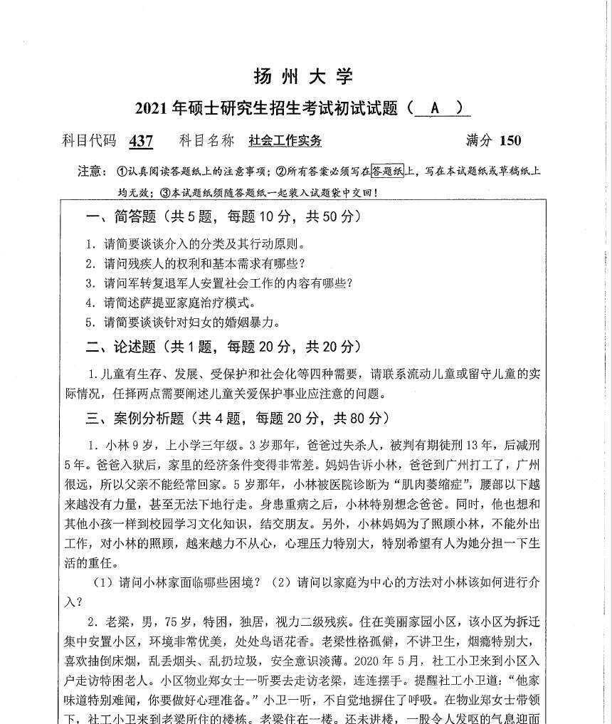 437-社会工作实务(扬州大学2021年硕士研究生招生考试初试试题).rar