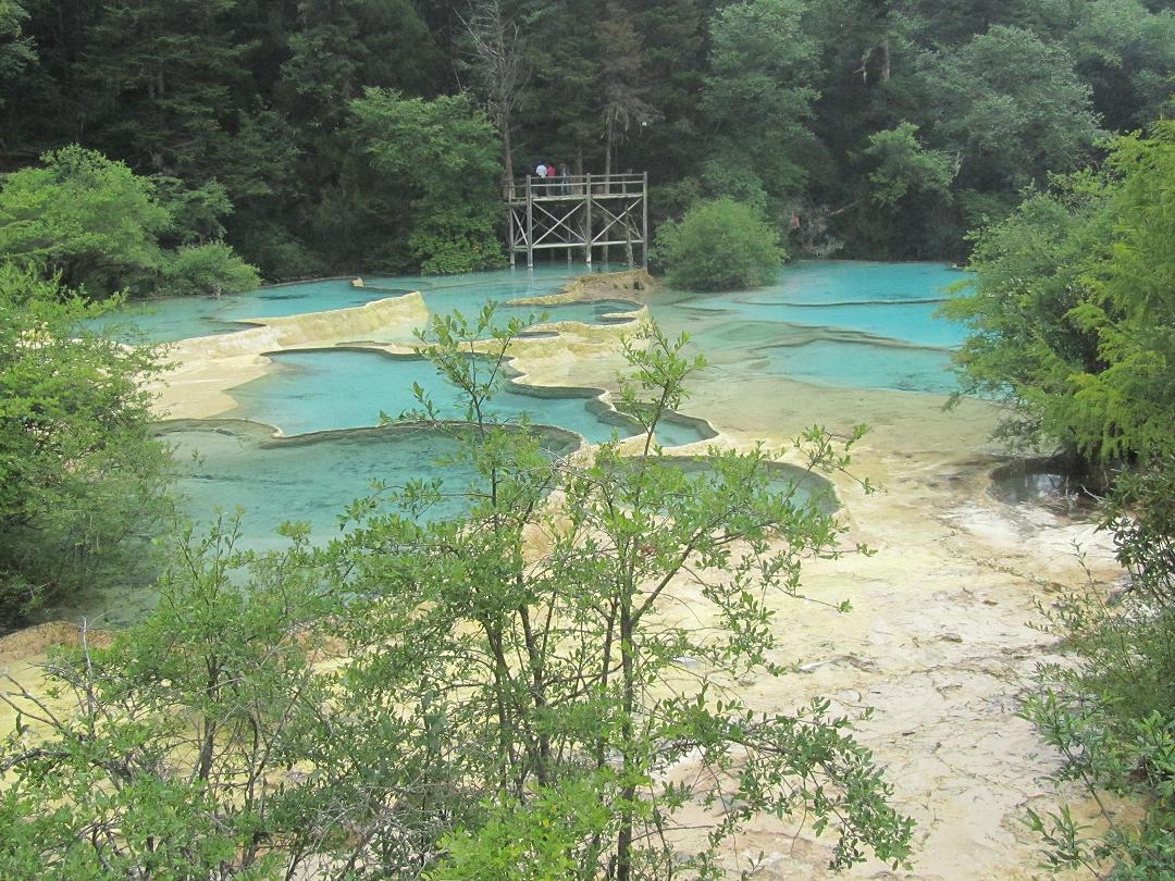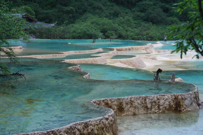 第一天,由于航班延误,九寨出租车刘师傅从8点一直等到11点,才接着我们,和他商量先到川主寺吃中饭,然后再上黄龙。在去黄龙的途中(在修路啊,不好走)同事的儿子(10周岁)有高原反应了( 估计是早晨起早赶飞机,再加上前一天晚上到成都已接近11点,没休息好),于是请刘师傅帮忙再找一辆车送我和女儿继续上黄龙,她带着儿子坐刘师傅的车回九寨(有点遗憾啊)。在这里要表扬一下我的女儿(11周岁),在整个行程中,一直很坚强,因为我们坐缆车上去,走到了五彩池后,她开始有高原反应了,头昏,走不动,想吐,看了好心疼,但也一直坚持走下来了,我想黄龙的奇观美景伴随着高原反应一定深深的留在她的脑海里了。黄龙门票200元,学生凭学生证可减50元,建议坐缆车(80元)上去,需时10分钟,缆车上看不到黄龙彩池景观,能够节约体力和时间。从缆车下车点沿栈道到五彩池约2.7公里,需时40-60分钟,一路为原始森林。到五彩池后沿观景道下山,约4公里,需2-3小时,每隔一段路都会有免费吸氧点,一次性吸管收费一元,如有高原反应可以吸氧休息,我没有高原反应,女儿有。印象深刻的是争艳池、金沙铺地和五彩池。我们一点半到的黄龙,六点半游完全程,八点半回到沟口康巴林卡。