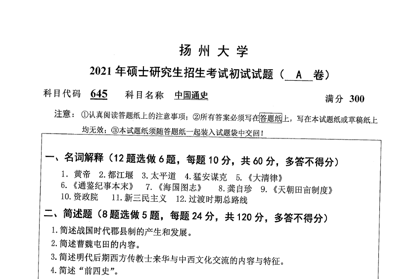 645-中国通史(扬州大学2021年硕士研究生招生考试初试试题).rar