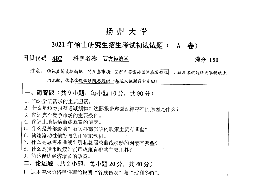 802-西方经济学(扬州大学2021年硕士研究生招生考试初试试题).rar