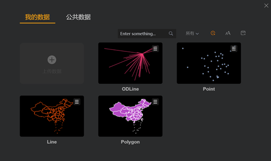 2、 在弹出的窗口中,选择我的数据 > 上传数据。右侧设有搜索工具栏,输入关键字,或按数据类型、时间、名称、大小排序。