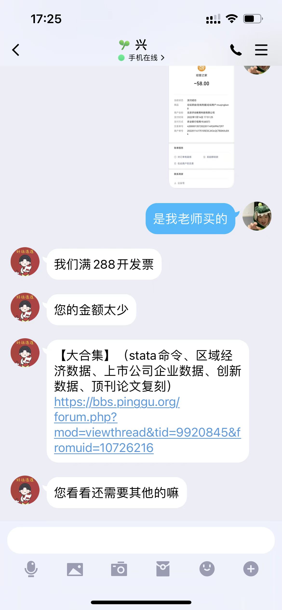 你好,我的学生从你这里购买了数据,索要发票受阻,因为金额不够大,但这条规定在税法里没有规定,在你交易信息里也没写明。请你及时给我们开具发票,谢谢。