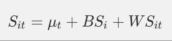 第三部分是因素内的波动性,是用W表示的,表示一个个体观测的分数和基于随机截距和总体均数所期望出来的分数之间的差异(纵向波动)。