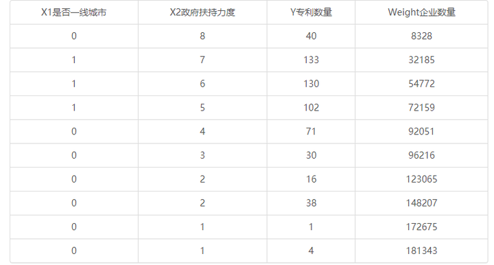 当前有一项针对专利数量的影响关系研究,研究政府对于企业的支持力度,是否一线城市,对于企业专利数量的影响情况。共收集10个城市的数据,如下: