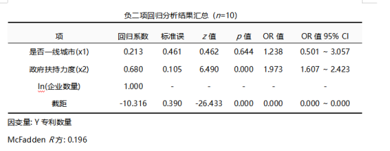 从上表可知,将X1为是否一线城市, X2为政府扶持力度,共2项为自变量,而将Y专利数量作为因变量进行负二项回归分析,从上表可以看出,模型公式为:Log(Y)=-10.316+0.213X1+0.680X2+ ln(企业数量)