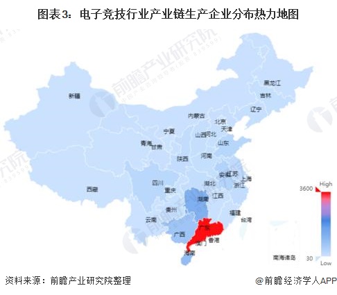 从我国电子竞技产业链热力图来看,广东省是我国电子竞技行业最为集中的省份,其次在湖南、广西等省份也有较多电子竞技企业分布。