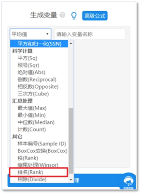 **操作:**选择【数据处理】→【生成变量】里排名功能。