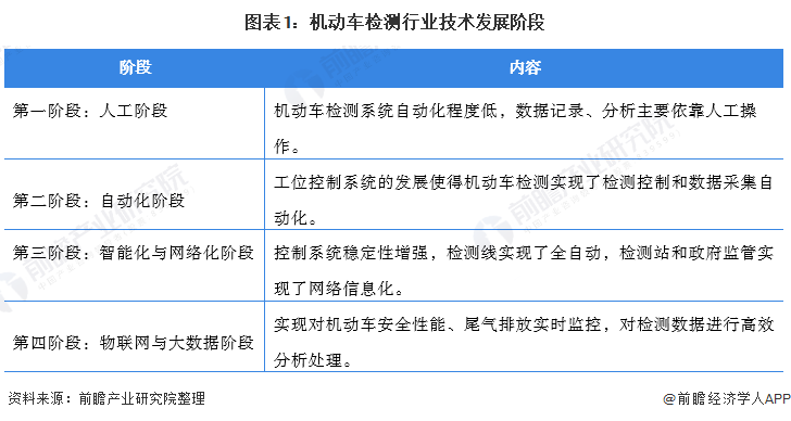 机动车检测行业有四个发展阶段:人工阶段、自动化阶段、智能化与网络化阶段和物联网与大数据阶段。我国由于技术发展起步晚,行业发展仍处于第三阶段。发达国家正处于第三阶段,并逐步向第四阶段(物联网和大数据)演进。我国机动车检测技术的整体水平处于行业发展第三阶段(智能化与网络化阶段)的起步时期。