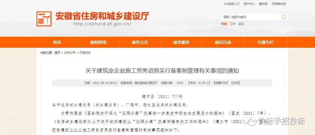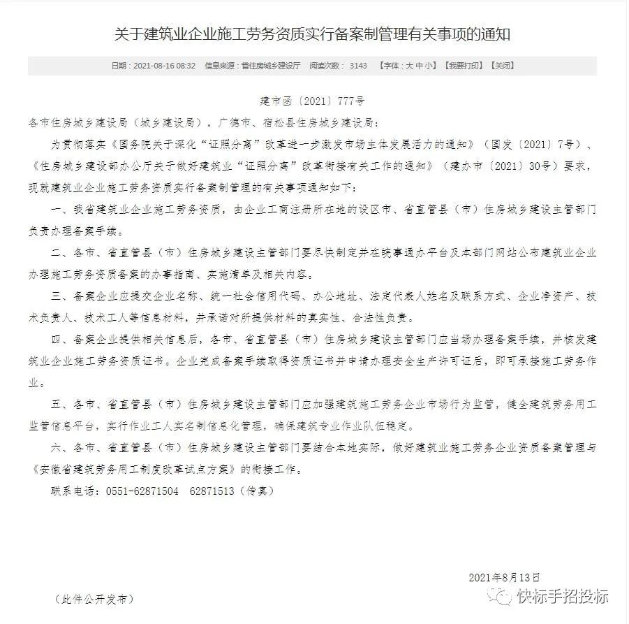 今日,安徽省住房和城乡建设厅发布《关于建筑业企业施工劳务资质实行备案制管理有关事项的通知》(下面简称《通知》)。