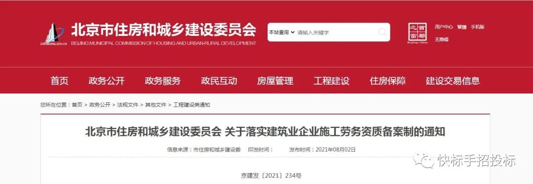 8月2日,北京市住房和城乡建设委员会发布《北京市住房和城乡建设委员会 关于落实建筑业企业施工劳务资质备案制的通知》,建筑业企业施工劳务资质备案实行电子化申报。