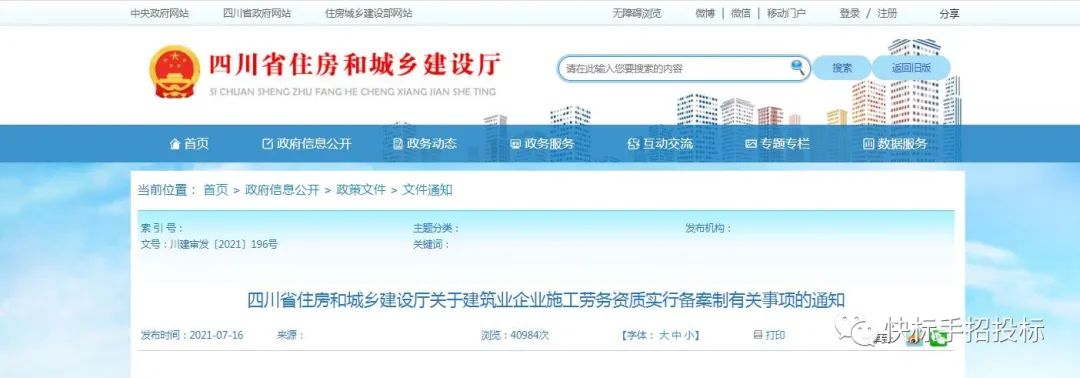 7月16日,四川省住房和城乡建设厅发布《四川省住房和城乡建设厅关于建筑业企业施工劳务资质实行备案制有关事项的通知》,通过备案制取得的施工劳务资质证书与通过审批制取得的施工劳务资质证书具有同等效力。