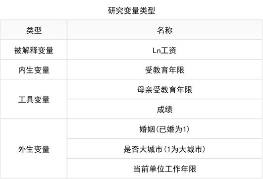 本案例研究‘受教育年限’对于‘Ln工资’的影响。明显的,从理论上可能出现‘双向因果关系’即‘受教育年限’很可能是内生变量。那么可考虑使用‘母亲受教育年限’和‘成绩’这两项数据作为工具变量。同时研究时纳入3个外生变量,分别是‘婚姻’,‘是否大城市‘和’当前单位工作年限’。使用两阶段最小二乘TSLS回归进行解决内生性问题。