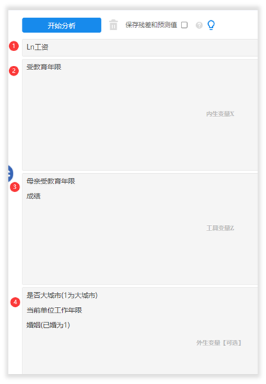 本案例分别将被解释变量,内生变量,工具变量和外生变量纳入对应的模型框中,如下:
