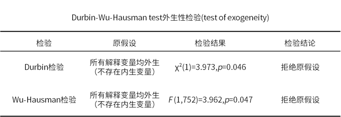 Durbin-Wu-Hausman test用于检验解释变量X(即内生外量)是否均为外生变量(即是否不存在内生变量)