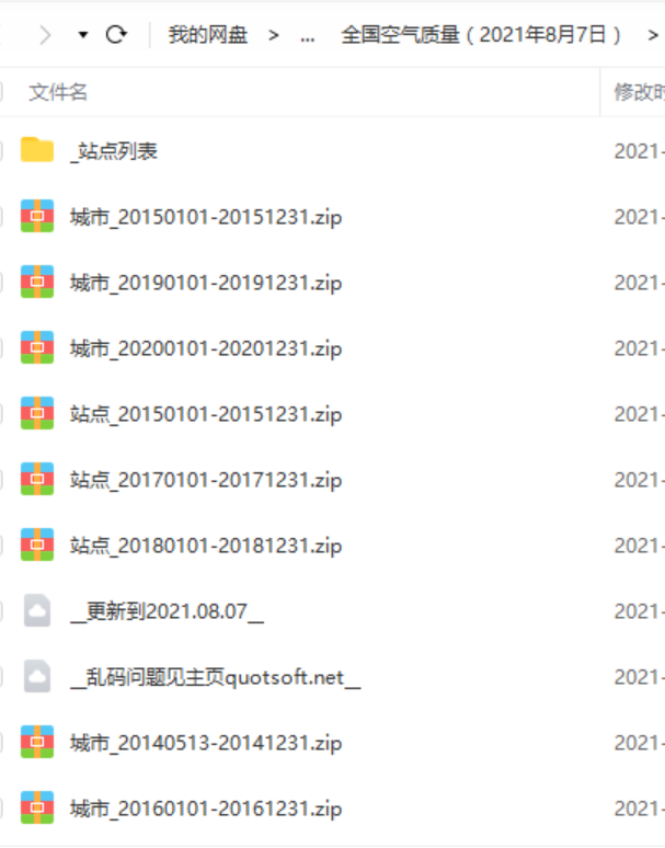 1、数据来源:| 中国气象历史数据 |() (数据可直接从该网站获取数据)2、时间跨度:历史数据更新至2021年8月3、区域范围:全国 4、指标说明:包括PM2.5、PM10、SO2、NO2、O3、CO六类大气污染物(1)数据格式说明全国监测点列表(CSV/XLSX格式,下载见网盘“站点列表-20xx.xx.xx起.csv”)第一列为监测点编码,第二列为监测点名称,第三列为所属城市,第四、五列为经纬度。(2)数据格式说明type数据类型单位AQIAQI实时值N/APM2.5PM2.5实时浓度(微克/立方米)PM2.5_24hPM2.5 24小时滑动均值(微克/立方米)PM10PM10实时浓度(微克/立方米)PM10_24hPM10 24小时滑动均值(微克/立方米)SO2SO2实时浓度(微克/立方米)SO2_24hSO2 24小时滑动均值(微克/立方米)NO2NO2实时浓度(微克/立方米)NO2_24hNO2 24小时滑动均值(微克/立方米)O3O3实时浓度(微克/立方米)O3_24hO3 24小时最大值(微克/立方米)O3_8hO3 8小时滑动均值(微克/立方米)O3_8h_24hO3 8小时滑动均值 的24小时最大值(微克/立方米)COCO实时浓度(毫克/