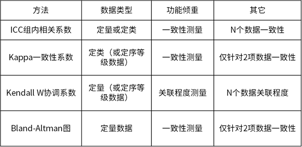 医学研究中进行一致性检验时,通常有以下方法如下表: