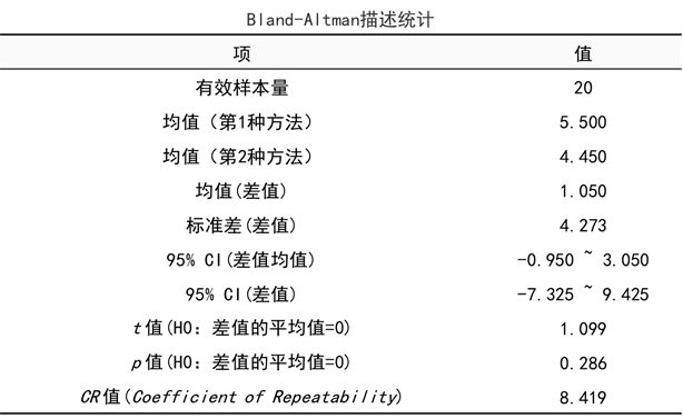 从上表可知:本次数据共有20个样本(测量对象),以及第1种方法和第2种方法测量的平均值分别是5.5和4.5,使用配对_t_检验显示,数据并没有呈现出显著性(p=0.286>0.05),即说明两种测量方法的差值并没有明显偏离数字0,也即说明两种测量方法具有一致性。