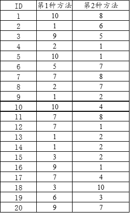 当前有医生使用两种方法分别做一项实验(针对20个研究对象),现需要对第1种和第2种方法共两种方法的测量数据进行一致性检验,数据结构如下图: