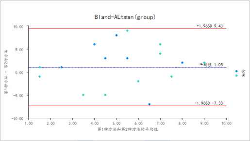 两种测量方法差值的95%置信区间为-7.325 ~ 9.425,如果说Bland-Altman图中的散点纵坐标基于均介于此区间范围内,则说明数据具有良好的一致性水平。