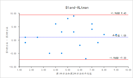 从Bland-Altman图可知,两种方法差值的均值为1.05,差值的95%置信区间为-7.33 ~ 9.43,所有测量数据均介于95%置信区间范围内,意味着本次数据具有良好的一致性水平。
