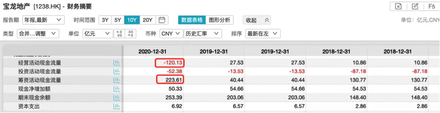 根据其财务数据,2020年宝龙地产经营活动现金流量自2015年来首次为负,且达到-120.13亿元,较2019年的27.53亿元,同比下滑536.36%。