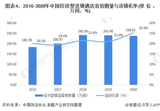 从全国酒店业整体连锁化率情况来看,近年中国经济型酒店业连锁化率还处于较低水平。2020年,全国经济型酒店的连锁客房数是238万间,非连锁客房数是704.3万间,连锁化率为25.3%。对比欧美成熟市场60%-70%的连锁化率,中国经济酒店连锁率还有很大的提升空间。