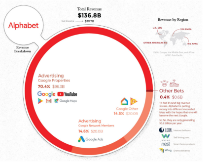 VisualCapitalist专栏作家Jeff Desjardins根据各家公司公布的年报数据用图表方式呈现了Alphabet(谷歌的母公司)的“生财之道”:可以看出,精准的广告投递给谷歌带来了超过七成的营业收益。