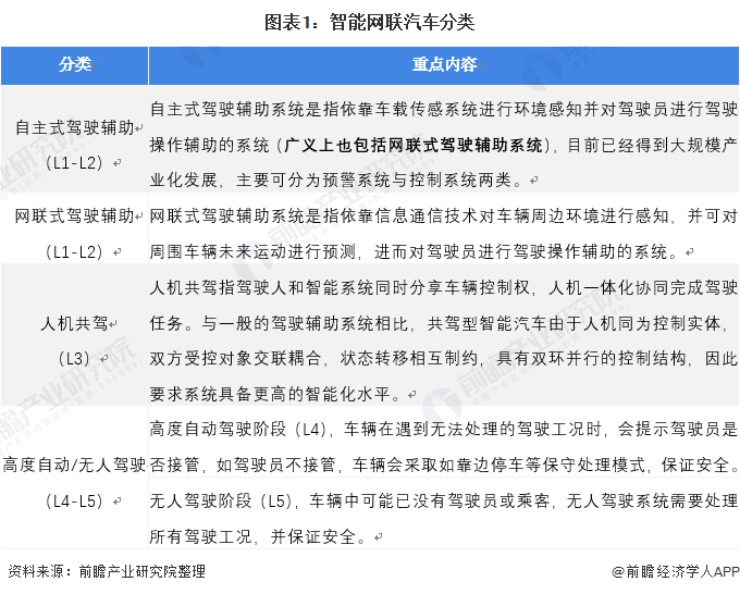 智能网联汽车大致分为:自主式驾驶辅助(对应美国汽车工程师学会SAE分级L1-L2)、网联式驾驶辅助(对应SAE分级L1-L2)、人机共驾(对应SAE分级L3)、高度自动/无人驾驶(对应SAE分级L4-L5)4个阶段。