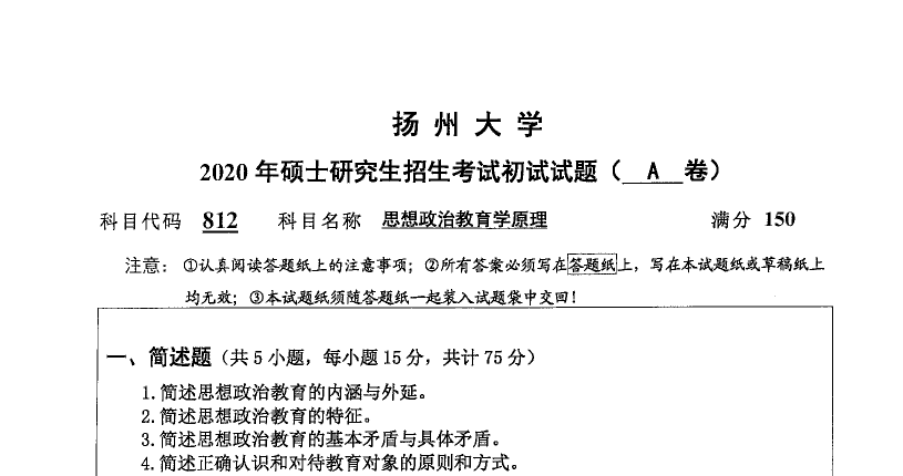 812-思想政治教育学原理(扬州大学2020年硕士研究生招生考试初试试题).rar