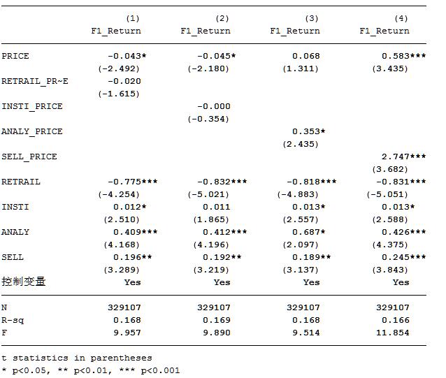 我们构建了如下两个计量回归模型,采用 OLS 多元回归估计方法分别检验低价股的溢价效应以及散户规模、机构投资者、证券分析师和卖空机制的相关调节作用。