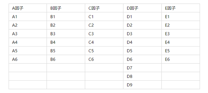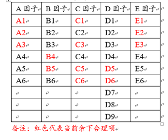 因子B余下B5,B6共2项;因子C余下C1,C3,C5,C6共4项;因子D余下D5和D6共2项;因子E余下E1,E2,E3共3项。最终余下项如下表格: