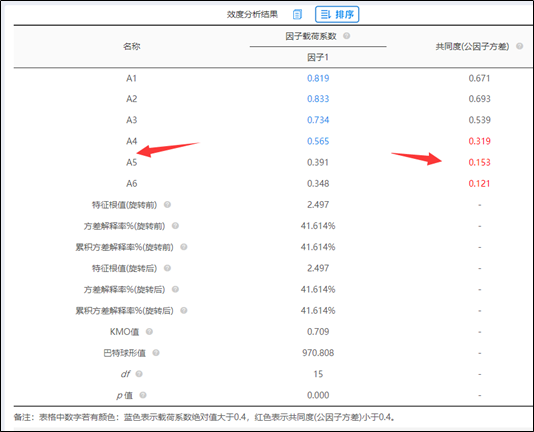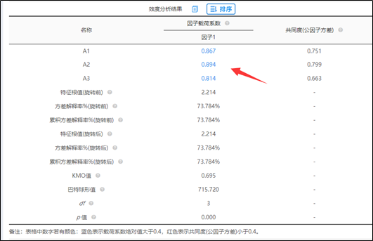 此时显示因子A余下3个‘测量项’(A1,A2,A3),而且‘测量项’的共同度值均大于0.6,且载荷系数值均大于0.8,说明余下3个‘测量项’还可以。