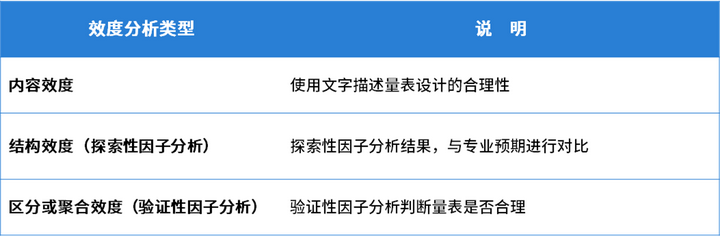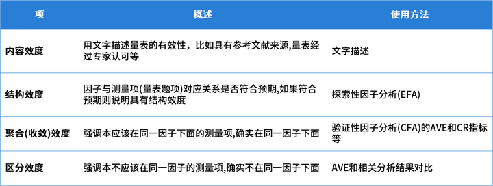 效度分析在学术研究中非常常见,其用于分析‘测量项是否真实有效的测量自己希望测量的变量’,效度分析的研究方式有多种,通常包括内容效度,结构效度(探索性因子分析法)和区分效度或聚合效度(验证性因子分析法)。可见下表格: