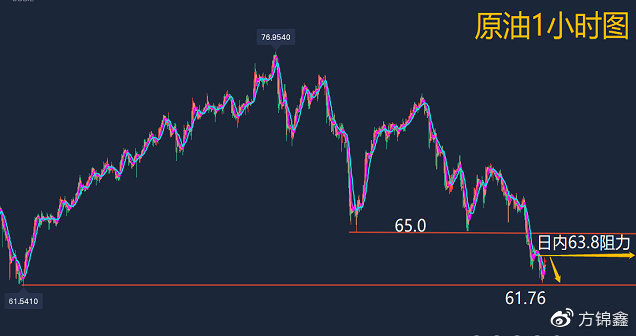 原油这个品种就是这样一旦趋势确认走起来就非常流畅,从下跌的幅度和速率来看本周并没有下跌到位,意味着下周对应的还有下跌空间和做空机会。但是60.4-60.0一线的支撑一定要重点关注,此位置也是黄金分割38.2%,大概率会在此区域开启超跌反弹的走势。上方的阻力位于63.50-63.80,也是反弹可能受阻的区域。综合来看,今日原油行情的下跌不会戛然而止,多头不死空头不止,中线目标还有距离,下看61.5-60.0.大一点波段性的空间可看至58.0-56.0一带。投资市场博大精深,行情瞬息万变,行情改变操作策略也会随之改变,尤其是在最近的局势下,此建议仅供参考,实时进出场点位及中长线布局咨询方锦鑫免费获取!