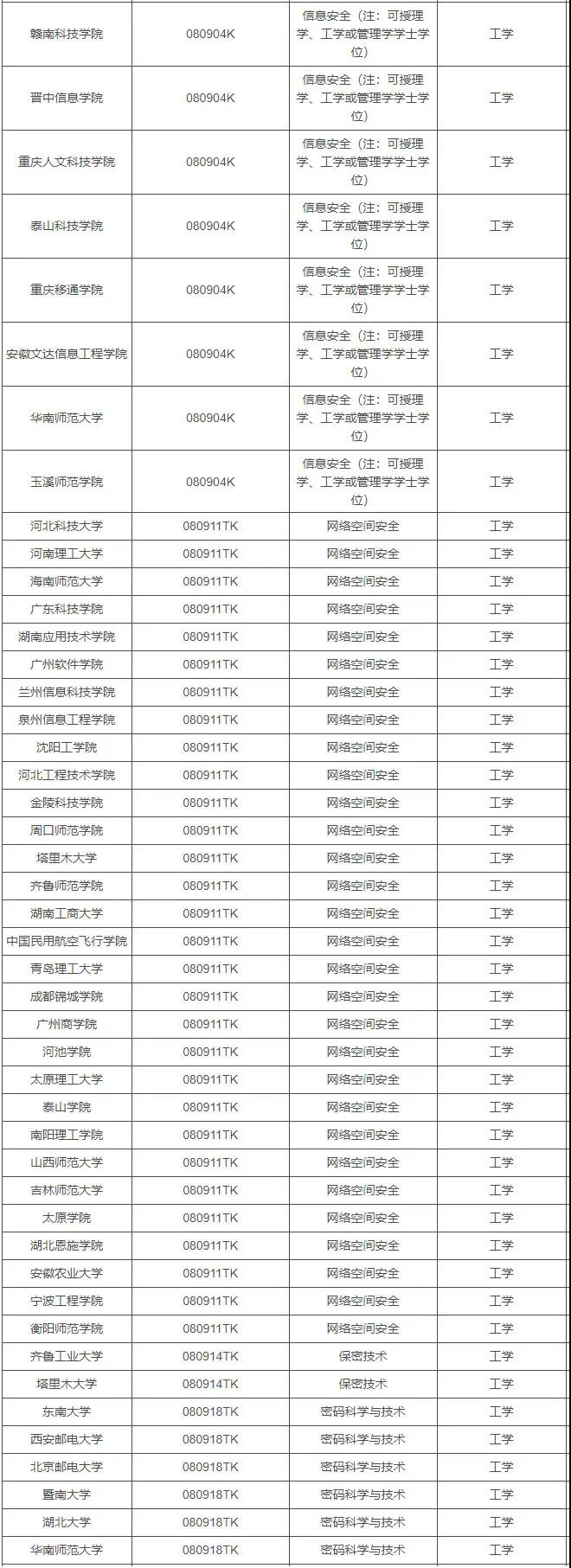 2021年8月9日,教育部官网发布《2021年度普通高等学校本科专业申报材料公示》(以下简称《公示》)。本次《公示》共拟新增本科专业445个,共有30所高校新增“网络空间安全”专业,此外还有8所高校新增了“信息安全”专业。2所高校新增了“保密技术”专业,6所高校新增了“密码科学与技术”专业。