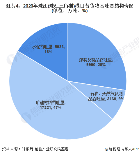 2020年,珠江港口矿建材料的吞吐量为17221万吨,占货物吞吐量总值的比重为47%,是珠江主要运载的货物;煤炭及制品吞吐量为9990万吨,占货物吞吐量总值的比重为28%,排名第二;水泥吞吐量为5933万吨,占比为16%;石油、天然气及制品吞吐量为3169万吨,占比为9%。